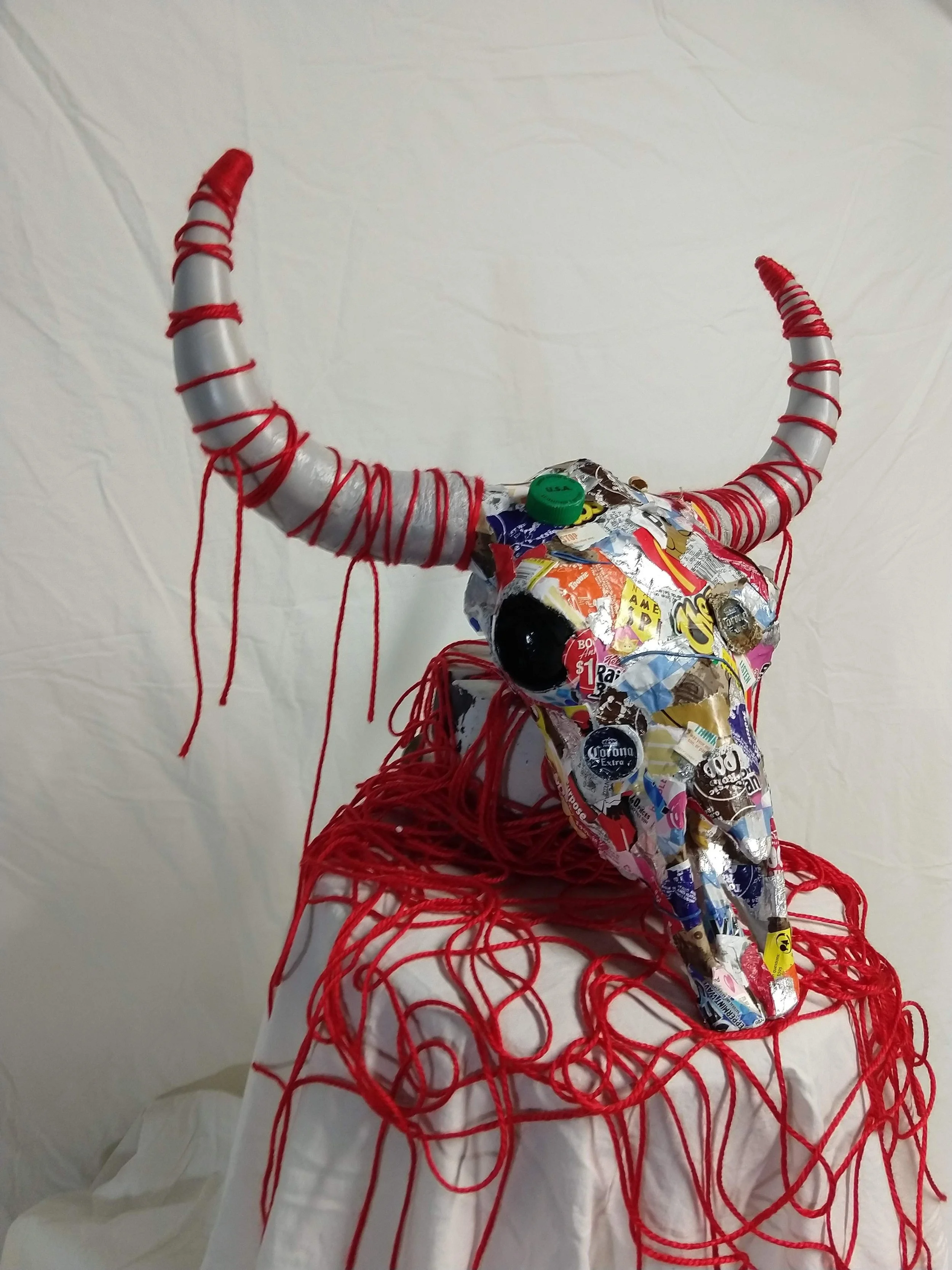 Materials: Bison skull, found trash, acrylic paint, yarn